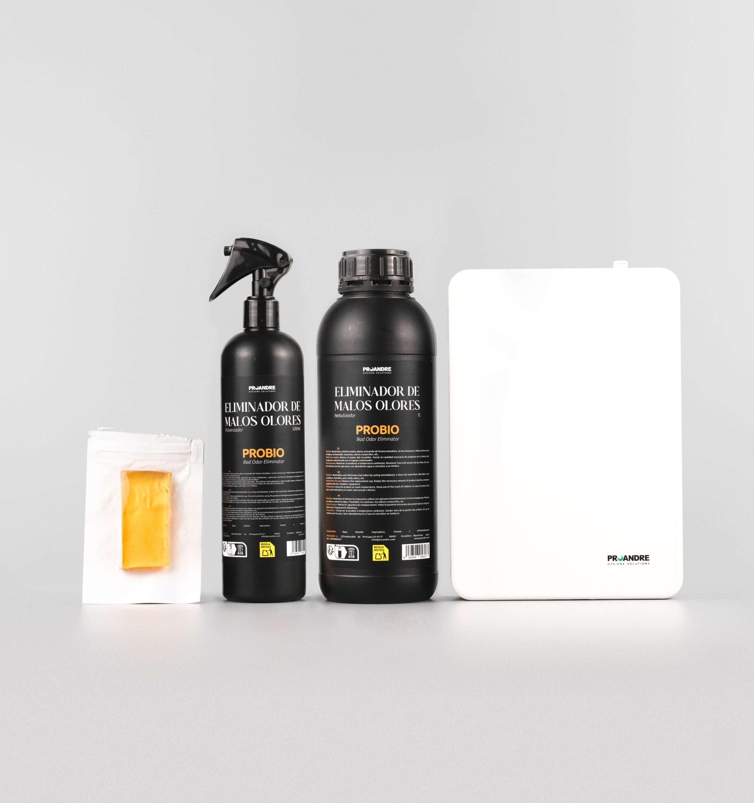 It is indicated for the treatment of odours emitted by, for example, rubbish, toilets, tobacco, sewers, containers, pipes, pets, etc. It can be used in environments with human or animal presence. Available in different formats to adapt to the customer's needs: